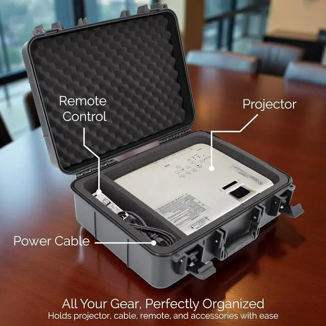 [CUSTOM FOAM COMPARTMENTS]: Pre-cut foam compartments hold your projector, remote, cables, and accessories in placekeeping everything secure, organized, and ready for use at a moments notice.