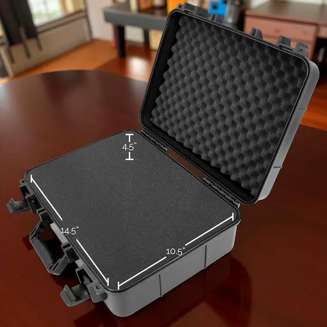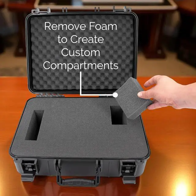 Includes tri-layer foam: 0.75" solid base, 3.0" pluckable foamcenter, and 0.75" egg-crate lid. Create a precise fit for yourprojector, remote, charger, HDMI cables, and more. The foam absorbsshocks and keeps your tech securely in place.