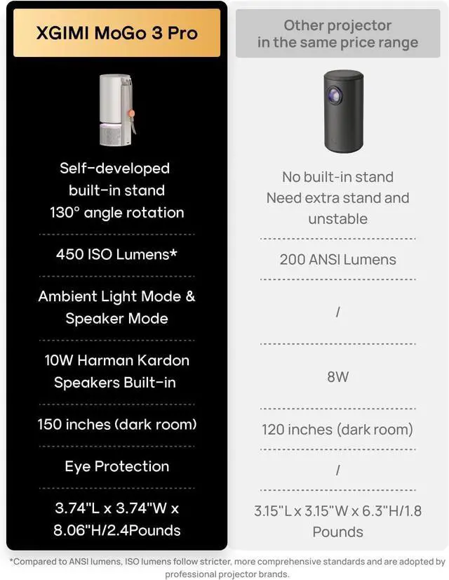 The MoGo 3 Pro projects up to 200 inches, which meets various projection requirements.