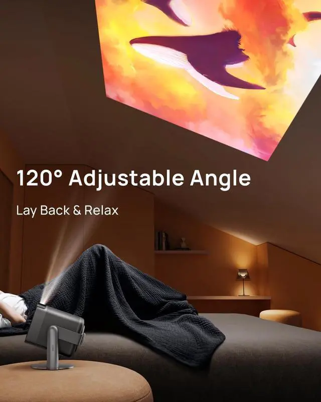 Multi-angle Rotation: 120° Adjustable Angle. Easily switch your projected image from the wall to the ceiling.