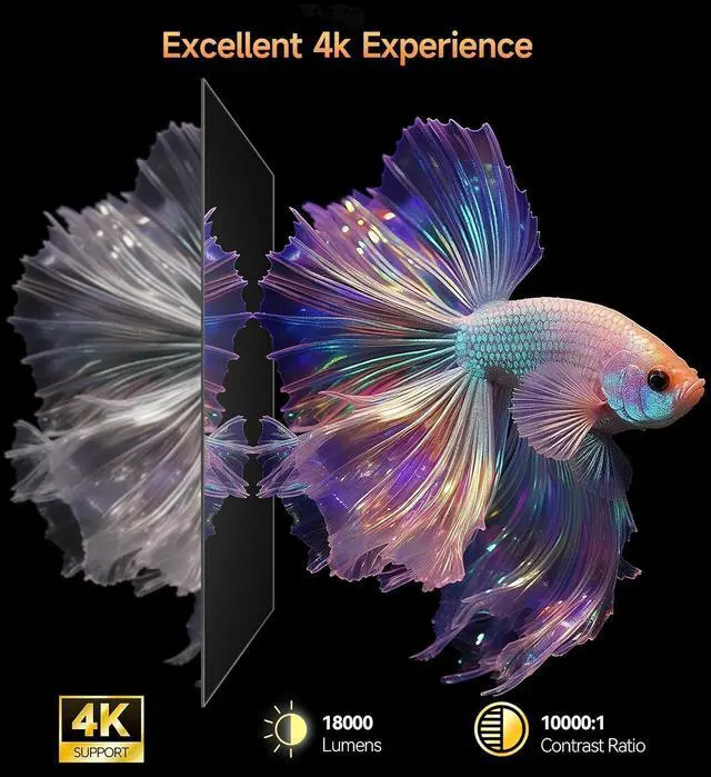 1080P HD Video ProjectionNative 1920*1800 resolution with 4K support delivers crisp and clear visuals. Features bluetooth 5.2 function,and connectivity to your favorite devices.this projector delivers stunning visuals with 15,000 lumens brightness and a contrast ratio of 10,000:1, ensuring vivid colors and sharp details.