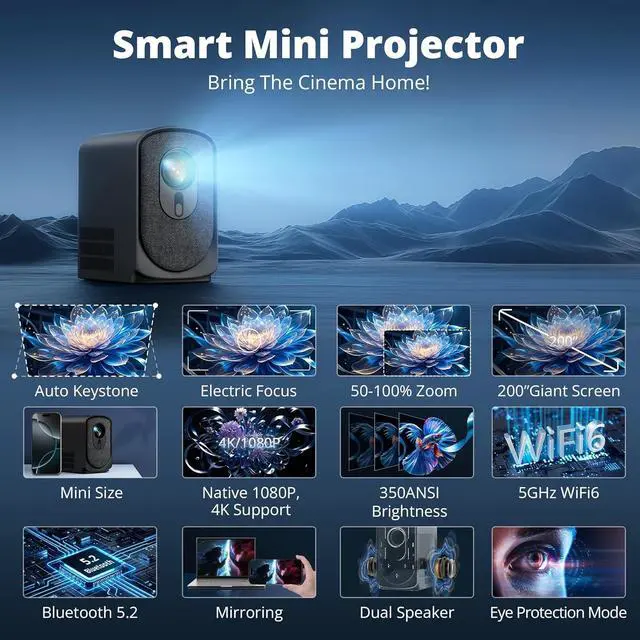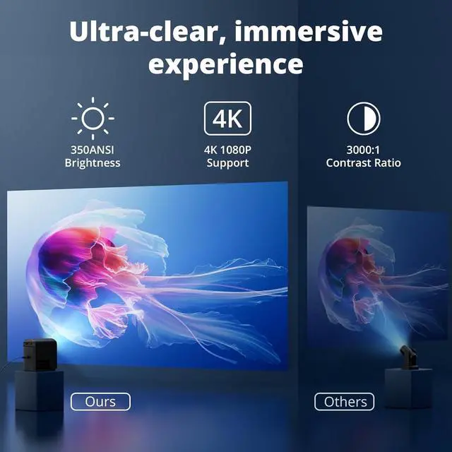 Native 1080P Full HD with 4K Support: Enjoy crystal-clear visuals with native 1080P resolution and 350 ANSI. Perfect for movies, gaming, and presentations, this projector delivers sharp, vibrant images with every frame, whether indoors or outdoors.