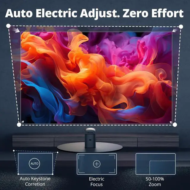 Auto Focus & Keystone Correction: Get a perfectly aligned image in seconds. Our smart projector automatically adjusts focus and corrects keystone distortion, giving you a clear, square image from almost any angleno manual setup needed