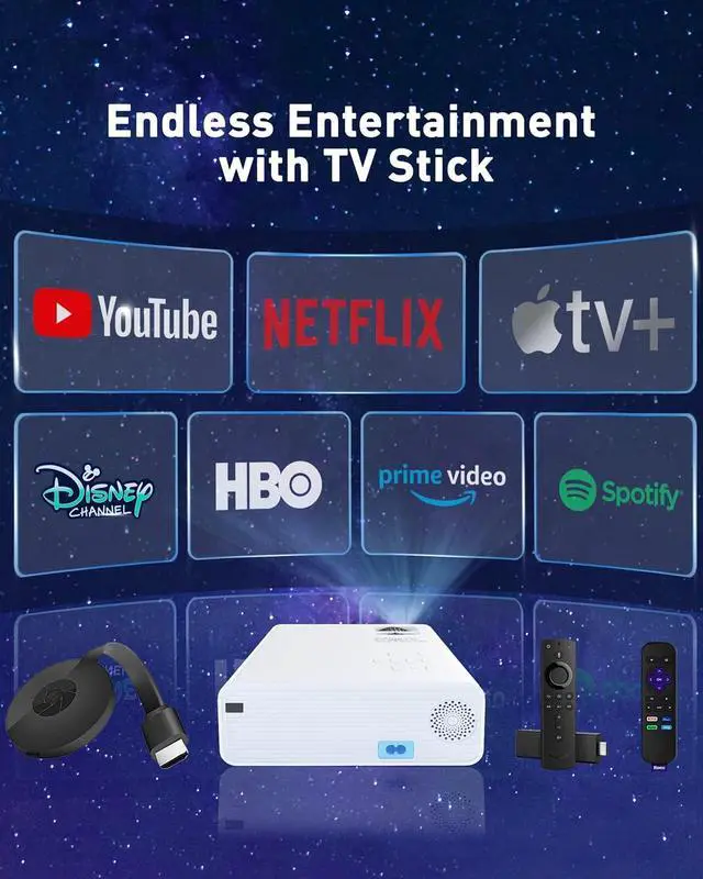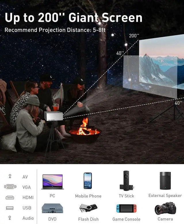 Easy to Set & Use: You just need to plug and play to stream from your phone or tablet. You can also connect with Fire Stick, Roku Stick, Chromecast, External Speakers, USB Disk, PS4/XBOX, Laptop/PC, DVD Players Player, and Mobile Phone/iPad via VGA/USB/HDMI/AV/Audio/Wireless Connection.