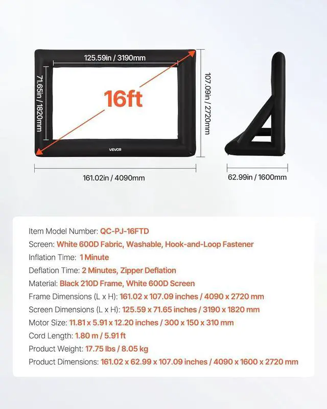 High-quality Material: This inflatable projector screen for outside uses high-quality Oxford fabric, which can resist creases and is easy to clean, ensuring clear, high-resolution images every time. The screen size is 10.46 x 5.97 ft. Front and rear projection are available with an aspect ratio of 16:9
