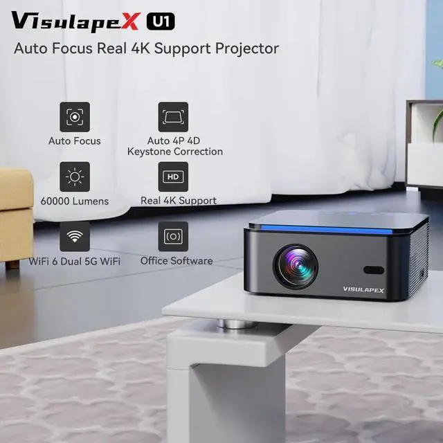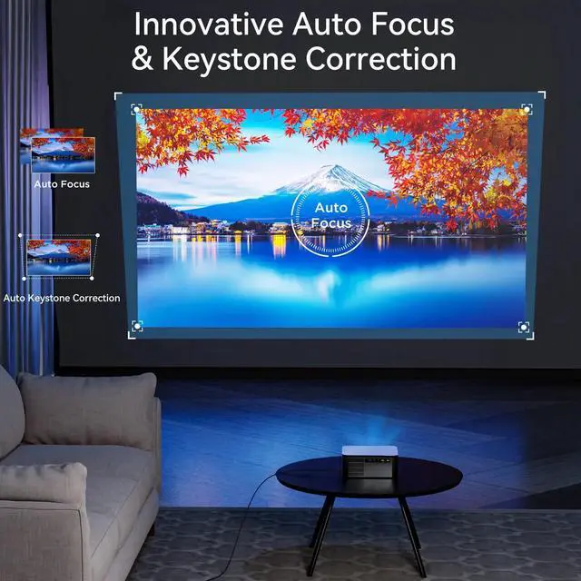 Innovative Auto Focus+4P 4D Keystone Correction+Zoom FunctionThis advanced auto focus technology help you get clear images easier and faster, no need to spend a lot of time in manual focusing. In addition, combined with ±45° vertical/horizontal keystone correction, plus 4P, you are able to adjust the image vertically/horizontally according to your needs via a remote controller, overcoming the limitations of room angle, bringing flexibility to front/side/ceiling projection. Last but not least, this 4K support projector with 50%-100% zoom allows you to adjust the image size without moving it.