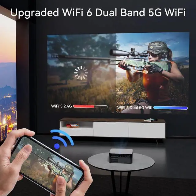 Upgraded WiFi 6 Dual Band 5G WiFiCompared with other projectors that only come with WiFi 5 chip 2.4G WiFi, it is equipped with WiFi 6 chip, 5G+ 2.4G dual-band WiFi, transmitting data speed 60% faster, which means you can watch videos or play games more smoothly and stable! No lag, no frame drops!