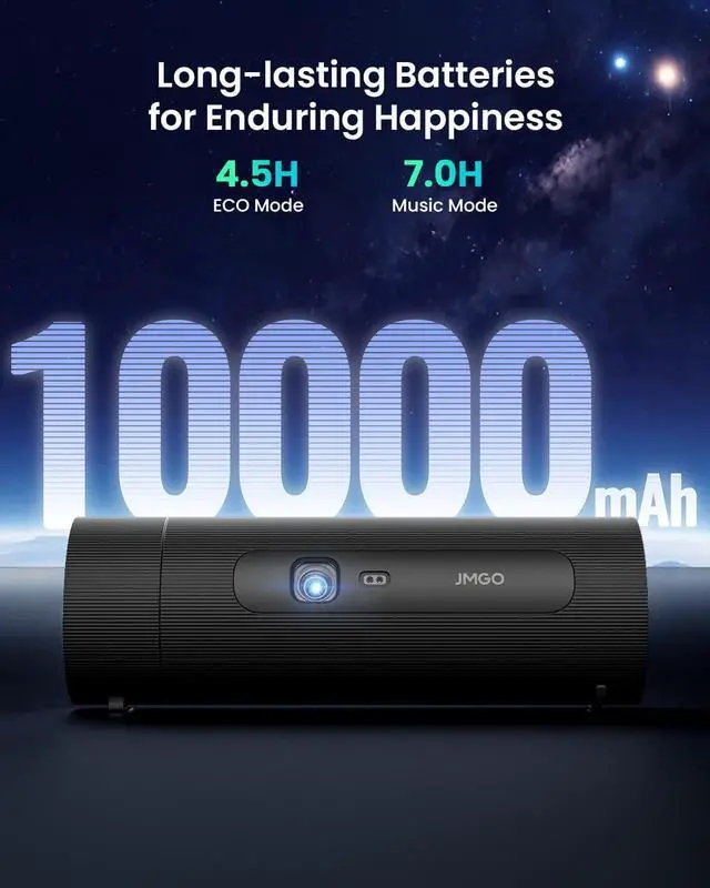 Immersive Surround Sound: JMGO PicoFlix projector features built-in 10W dual speakers with Dolby Audio, providing a cinematic sound experience right in your home. Whether its thunderous explosions or subtle background music, it delivers deep bass and crisp highs for complete immersion in every movie and music track. Perfect for both quiet movie nights and lively gatherings, the projector also functions as a Bluetooth speaker, making every moment unforgettable.