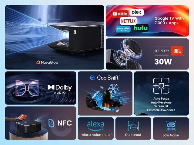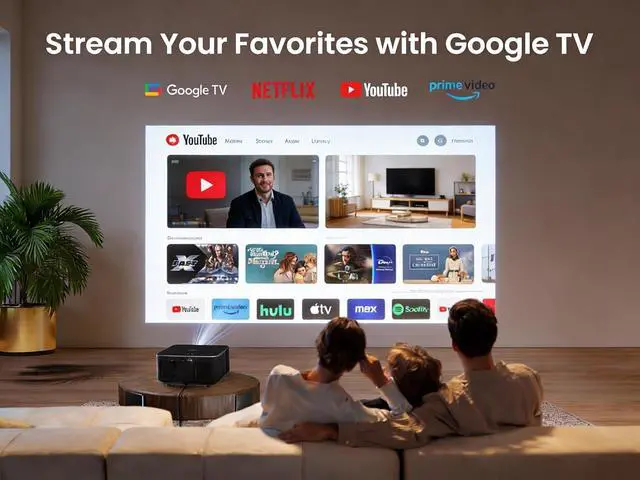 Built-In Google TV with 7000+ Apps True Smart EntertainmentAs a genuine Google TV projector and smart projector with wifi and bluetooth, it gives you direct access to Netflix, Disney+, YouTube, and thousands more appsno extra sticks or devices required. Set up in just 5 minutes and stream anything, anytime. This versatile video projector meets all your viewing needs.