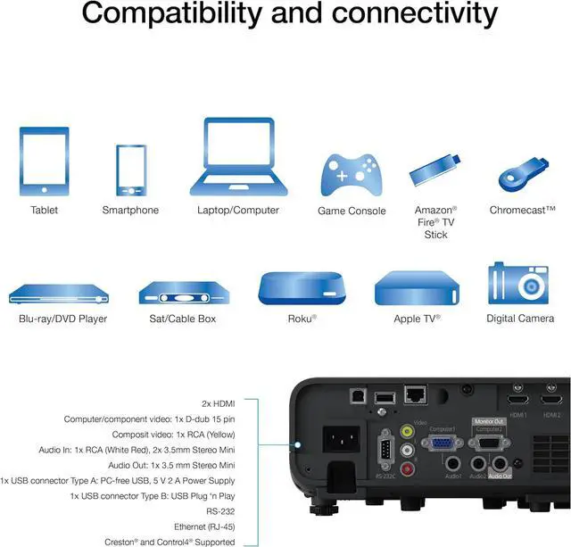 Epson Pro EX11000 3-Chip 3LCD Full HD 1080p Wireless Laser Projector, 4,600 Lumens Color/White Brightness, Miracast, 2 HDMI Ports, USB Power for Streaming, Built-in 16W Speaker