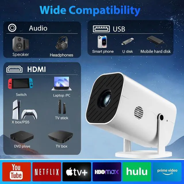 Strong Compatibility And Built-in SpeakersYGSKK projector for bedroom is equipped with three interfaces: HDMI, USB and audio (with an HDMI cable included). It is compatible with TV sticks, TV boxes, DVD players, laptops, USB flash drives, Switch/PS5, PC and other devices. The projector is built with high-fidelity stereo speakers, providing excellent and clear audio quality for an outstanding audio experience. It is also an excellent mini projector suitable for both indoor and outdoor activities