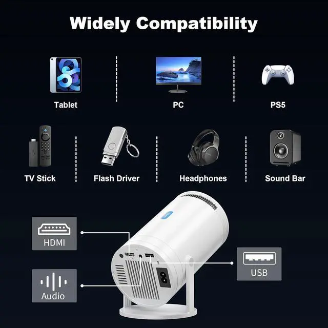 Phone Projector with Wide CompatibilityThis 4k projector comes packed with AV, USB and HDMI ports, making it compatible TV Sticks, laptops, tablets,PS4/5, USB flash drives and more, which is the ultimate solution for your home theater, video gaming, party vibes, or outdoor fun