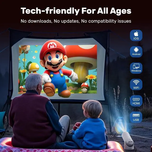 Plug & Play Simplicity for Kids & Elderly No App Hassle! Designed for universal plug-and-play ease, this mini portable projector works seamlessly with any device! Instant screen mirroring viawifi projectorconnectivity (2.4G/5G) or wired HDMI/USBeffortlessly connect laptops, gaming consoles, or smartphones (iOS/Android/Windows). No apps, downloads, or tech skills neededjust plug in and project within seconds. A portable projector with wifi and bluetooththats perfect for families, kids, and elderly users who crave simplicity.