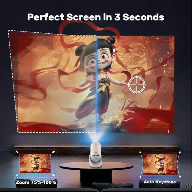 Auto Keystone + 50%-100% Zoom AI smarts rescue crooked screens in 3 seconds! This mini wifi projectorauto-fixes top/bottom mismatches, transforming warped images into perfect rectangles. Use 50%-100% digital zoom to resize screens without moving the deviceideal for adapting yourbluetooth wifi projectorto any space, from dorm rooms to conference halls.