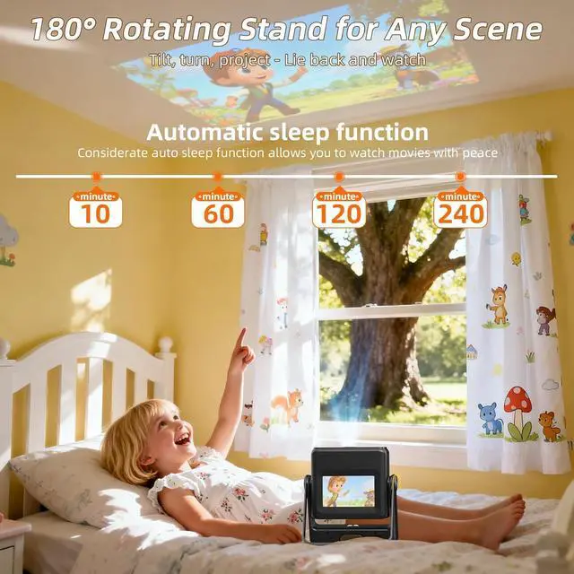 1. 180° Swivel Mini ProjectorThe projector base is equipped with a 180° swivel bracket, which allows the projector to point in various directions, including from the wall to the ceiling. Immerse yourself in a wide screen of 30-130 inches for a truly immersive viewing experience.