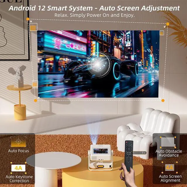 Short Throw Projection&Long Lamp Life With short throw technology, the projector for bedroom can project a large image even from a short distance, making it perfect for smaller rooms or limited spaces, so that you can enjoy a big-screen experience without needing a large area for setup.The powerful cooling system effectively cools the heat of the bulb, extending the lamp life to 65,000 hours.