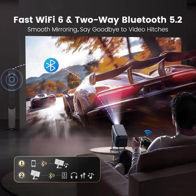 Dolby Audio & Theater-Grade Sound Immersive Hi-Fi ExperienceDual 10W speakers are powered by Dolby audio enhancement, TDS-HD, and SRS sound systems, delivering rich surround sound with deep bass and crystal-clear detail. AI sound balancing ensures distortion-free audio, whether you're streaming music, watching films, or enjoying live concerts. Use two-way Bluetooth 5.2 to turn the projector into a standalone speaker or connect wirelessly to headphones and external speakers. HDMI ARC enables seamless one-cable hookup to soundbars and AV receiversgiving you fuller, more powerful sound than standard single-way Bluetooth projectors.