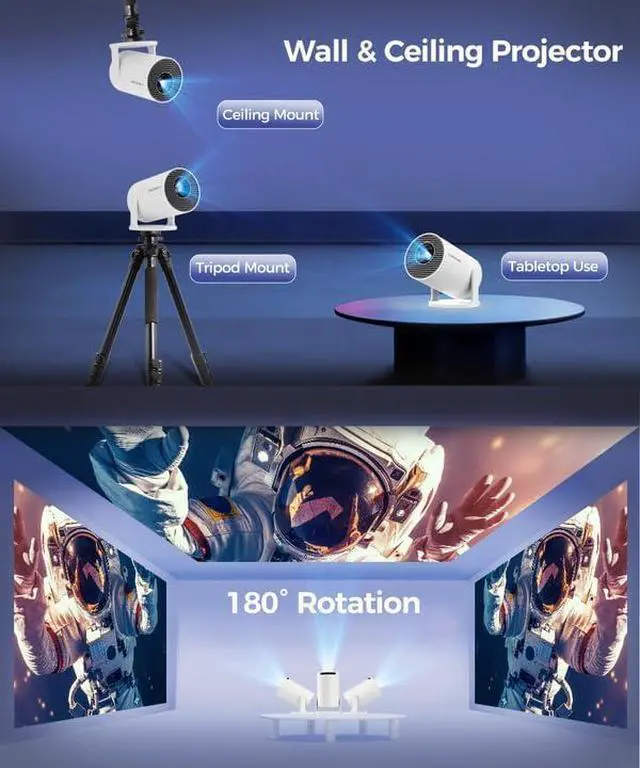 Built-in dual band WiFi 6 & 180°Rotatable Portable ProjectorIt doesn't require fixed installation, allows for flexible adjustment of projection angles,can project onto the ceiling, and is not constrained by the environment offers unparalleled versatility and convenience. Built-in dual band 5G Wifi 6, experience reduced latency and improved responsiveness, ideal for video conferencing, and other real-time applications, ensuring smoother, more immersive experiences without delays or lag