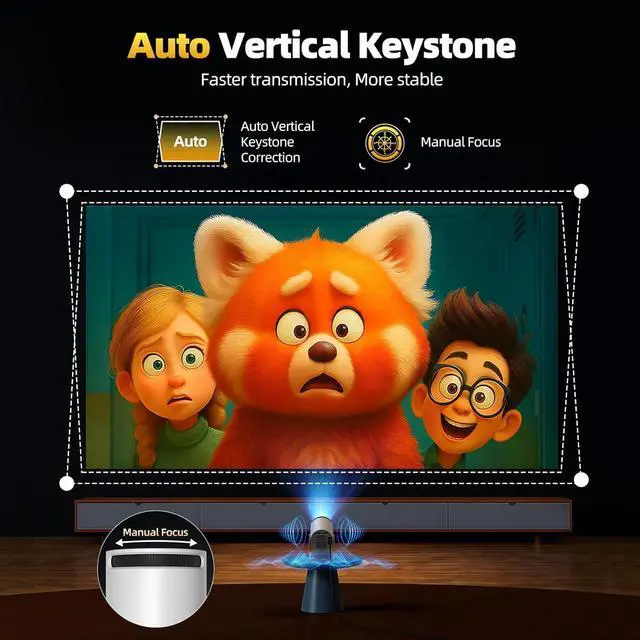 Set Up in Seconds: Auto Keystone & Quick Focus No more fiddling with settings. Automatic vertical keystone correction instantly straightens the image from any up or down angle. Then, a simple twist of the focus ring gives you razor-sharp clarity in seconds. Ideal for bedroom projector setups or impromptu outdoor movie projector sessions. (Note: Horizontal keystone correction and auto focus are not available.)