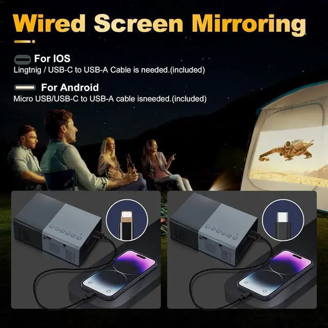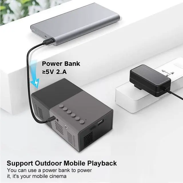 Power supply&Mini You can power the projector with just a phone charging cable. This pocket size projector is only 5.1inchx3.1inchx1.1inch (0.6 pounds), not much bigger than your smart phone. You can take it anywhere and anytime.Whether you are watching movies, playing games, or party with friends, this is your great private theater.Equipped with various ports such as USB / AV /HD Audio. It can be easily connected with your smartphone,TV Stick, PS4/5, tablet, laptop.