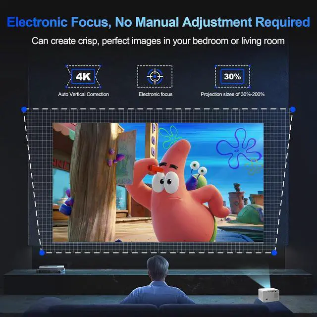 Electronic Focus & Auto Vertical Keystone Say goodbye to tedious manual focusing! Simply use the remote control for instant electronic focus to get sharp, clear images. Equipped with ±15° vertical keystone correction, it quickly presents a crisp, square imagemaking it incredibly user-friendly even for first-time users. Enjoy perfect, sharp visuals in your living room, bedroom, or outdoor projection setup with zero hassle