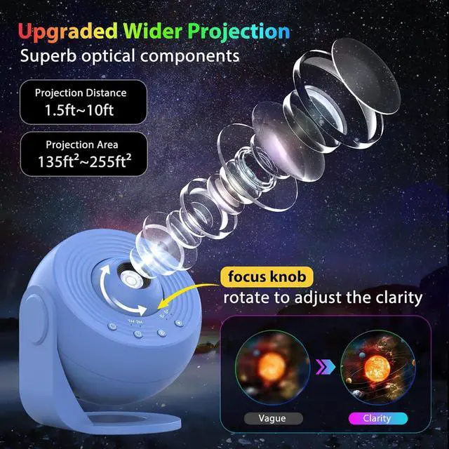 2. Adjust the Knob to Get HD Projection:This upgraded galaxy projector uses better optical components to present vivid colors and projector larger and brighter star images than the classic version. Please adjust the focus of the galaxy light projector by rotating the focusing head for clear and realistic imaging. ( The ultimate effect depends on the ceiling area, room lighting brightness, and the projection length and angle)