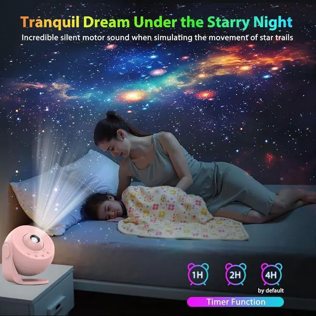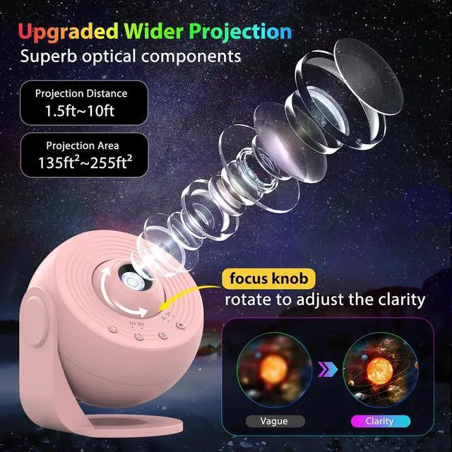 Adjust the Knob to Get HD Projection:This upgraded galaxy projector uses better optical components to present vivid colors and projector larger and brighter star images than the classic version. Please adjust the focus of the galaxy light projector by rotating the focusing head for clear and realistic imaging. ( The ultimate effect depends on the ceiling area, room lighting brightness, and the projection length and angle)