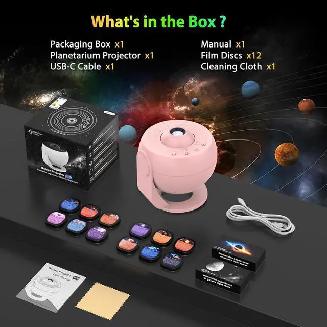 Pro Version 12 in 1 Planetarium Projector: Please pull the tray handle to replace the slide to switch the galaxy pattern. Transform your room into 13 stunning universe spectacles using film discs. The pattern names are 1: Earth, 2: The Milky Way, 3: Black Hole, 4: Observable Universe 5: Solar System, 6: Small Magellanic Cloud, 7: Valentine's Day, 8: Local Group, 9: Virgo Supercluster, 10: Laniakea Supercluster, 11: Wormhole and 12: Mystic Mountain. 13: Moon (in-built).