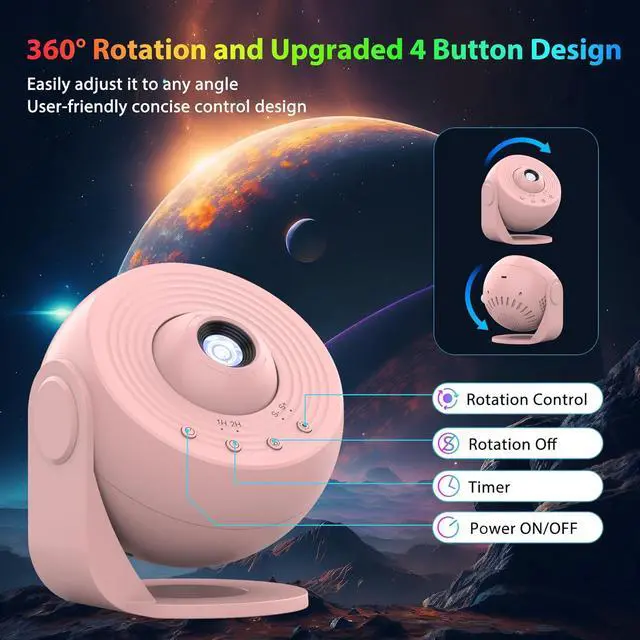 Timer Function & Simple 4-Button Control: This star projectors boasts for its easy-to-use 4 button design. The buttons from left to right order are the following: Power Button, Timer Button (1h/2h, 4h by default), Rotation Off, and Rotation Button (2 rotation speeds available). The new Rotation Off button enables you to turn off the rotation immediately.