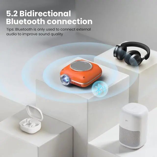 Two -Way Bluetooth: This mini projector features bidirectional Bluetooth 5.1, allowing you to connect external Bluetooth speakers for enhanced sound quality or use the projector as a Bluetooth speaker to play music directly from your phone