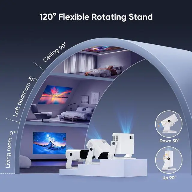 Portable mini projector: 120° rotatable stand simplifies the installation and realizes the best projection effect in any scene, which is not limited by height, can be projected flexibly to various corners including the ceiling. customize the image size to fit various environmentsno fuss, just perfect projection