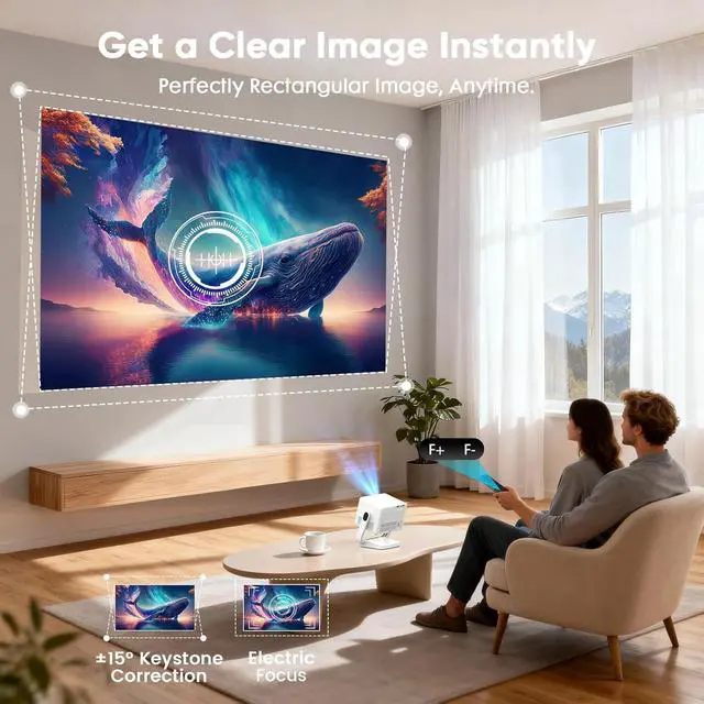 Electric Focus & Auto Keystone Electric focus and auto keystone correction provide exceptional convenience. With electric focus, you can achieve a sharp image with just the press of a button on the remote control. Auto keystone correction simplifies the setup process. You can simply place the outdoor projector in a convenient location, and the bluetooth projector will automatically detect and correct image distortion.