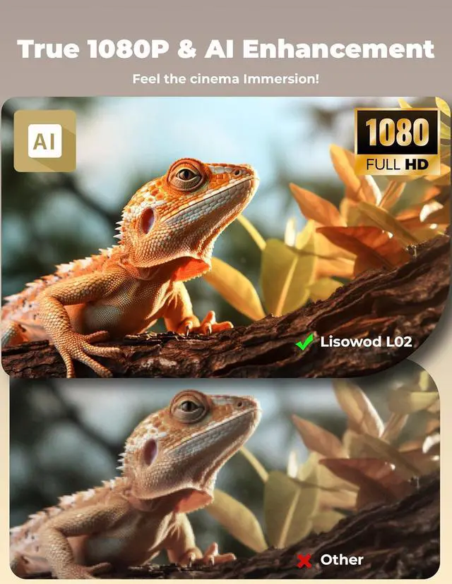 [1080P FHD & 1300 ANSI: Small Size, High Brightness]: Compared to other mini projector on the market, the Lisowod L02 mini projector upgrades with 50 additional high-brightness LED lamp beads and advanced 3-chip 3-LCD technology, along with native 1080p resolution that displays 100% RGB color signals in every frame. This allows the L02 mini projector with wifi and bluetooth to deliver superior brightness in a compact size, outperforming regular mini projector of similar size. And ultra-high 20,000:1 contrast ratio, the L02 projector with wifi and bluetooth ensures every projection detail is crisp and clear. Let the L02 projector with wifi and bluetooth kick off your home theater experience