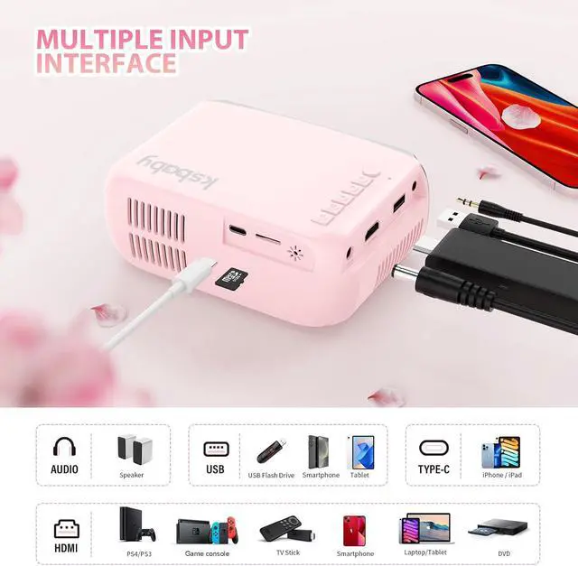 Mini Projector WiFi Home Theater Portable Projector, Phones Can Be Connected to The Movie Projector Via WiFi or Via Data Cable, Compatible With Smartphone/ Tablet/ Laptop/ TV Stick/ USB Drive Pink