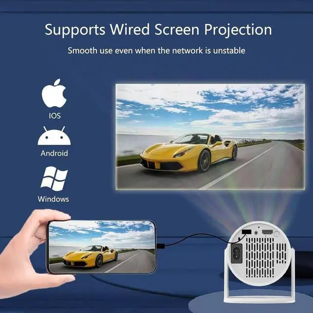 Mini Projector & All in One HandThe net weight of the projector is only 1.1 pounds net, the body is only diameter 3.9x7.4in, like the size of a smartphone, which does not take up much spaceand can be easily put into the bag.Take it anywhere, and savor high-quality visuals, whether you're indoors or outdoor.Our projector also supports wired screen projection for smooth use even when the network is unstable.