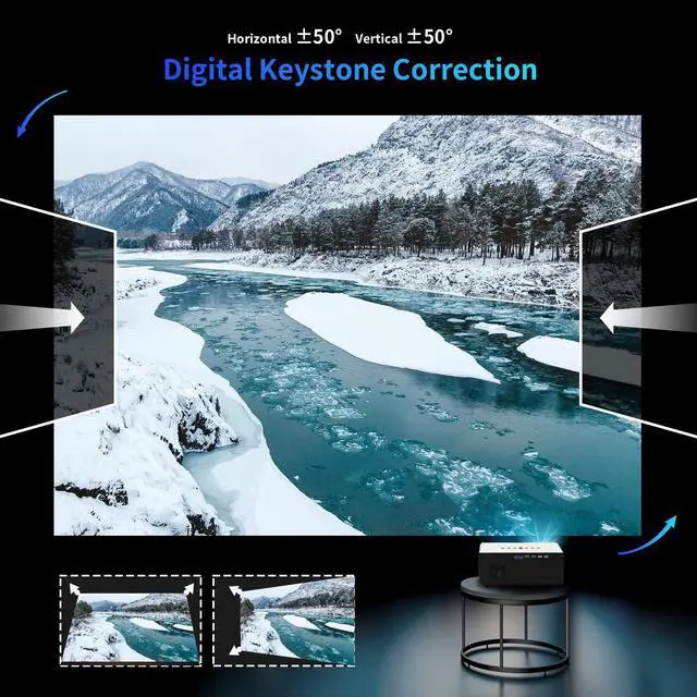 500" Big screen & 4D/4P Keystone Correction & Image zoom 50%Viewing Experience with a wide range of 60-500 inches at home, This portable projector with the innovative 4D/4P Keystone correction. It can adjust Vertical and Horizontal angles ±50° and support side projection, you could watch from almost every angle. With the ZOOM function, it can adjust image size from 50% to 100% display what size you want without moving the projector.