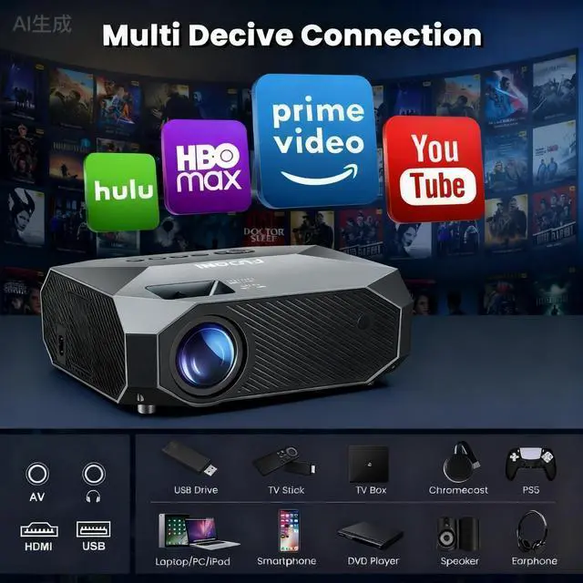 Compatible with Multi DevicesThe FUDONI bluetooth projector provides HDMI/USB/AV port/3.5mm audio port , which can connect with TV stick , Smartphone, Laptop, Chromecast, DVD Player, external speakers, PS4, USB flash, etc. Easily meet your movie, match, and game needs.(Due to copyright issues, it can't support watching the videos on Prime Video, Hulu, Disney etc while screen mirroring, but it will works well by HDMI connection if you use the TV Stick or Roku Express.)