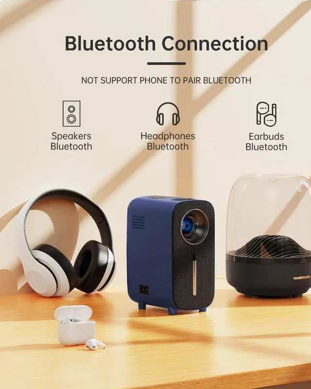 Bluetooth Connectivity for Immersive Audio: This small video projector comes equipped with a powerful 5W built-in speaker, delivering crisp, clear sound. With a maximum screen size of 200 inches, it brings an unforgettable experience to your indoor or outdoor movie nights. The advanced Bluetooth 5.3 chip allows seamless connection to Bluetooth speakers and headphones for enhanced audio. (Note: Bluetooth does not support phone connections.)