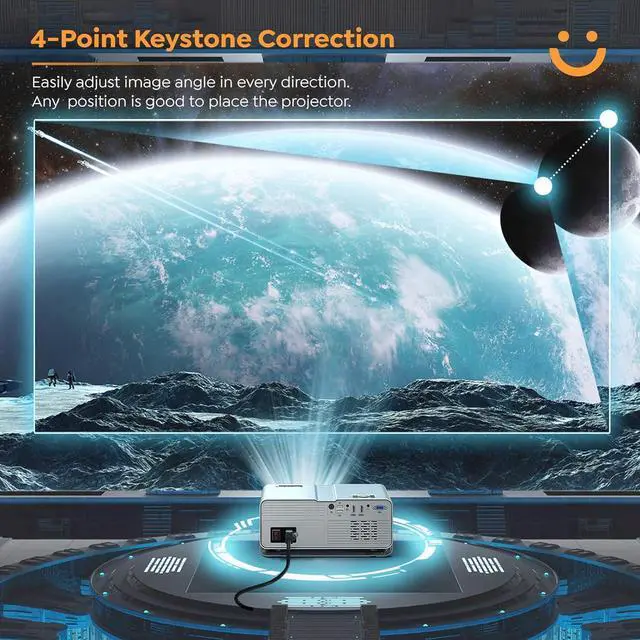 4P Keystone Correction and 50% ZOOMWith upgraded 4-point digital keystone correction, this video projector can be quickly adjusted to a square screen regardless of its placement. The digital zoom function can shrink the image size from 100% to 50% using the remote without moving the projector.