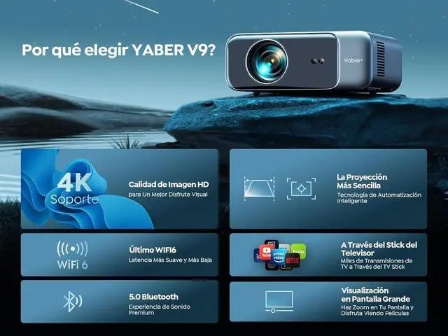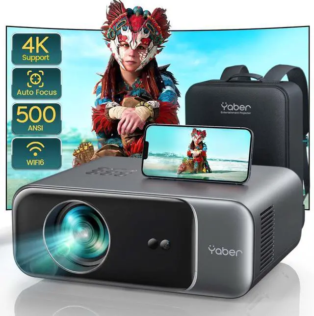 Smart Auto Focus & Auto 6D Keystone CorrectionEffortlessly getting a clear and well-aligned image in 5 Seconds after powering on! YABER 2023 4k projector comes with auto-focus and 6D auto-keystone technology, save hassle of manually adjusting, easily set up for movies or games.With the built-in displacement gyroscope and sensor, this smart projector can automatically detect changes and movement in the environment, adjusting the picture accordingly to ensure it stays clear.