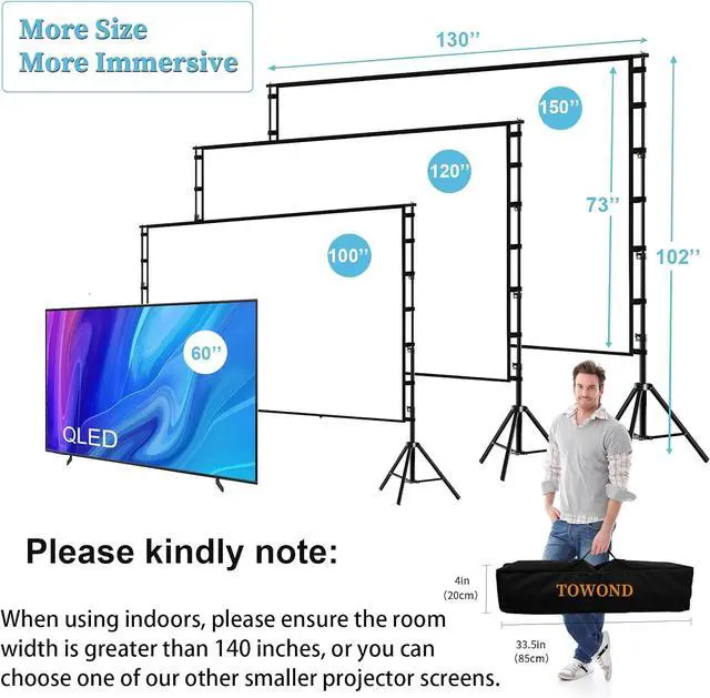 Projector Screen with Stand. 150-inch diagonal, 160°wide viewing angle, aspect ratio 1:1 and 16:9 4k HD portable projector screen is made of high quality natural polyester fiber. Towond projector screen offers sharp and bright images. Thick and anti-crease design giving you more fun, even support FRONT and REAR projection.