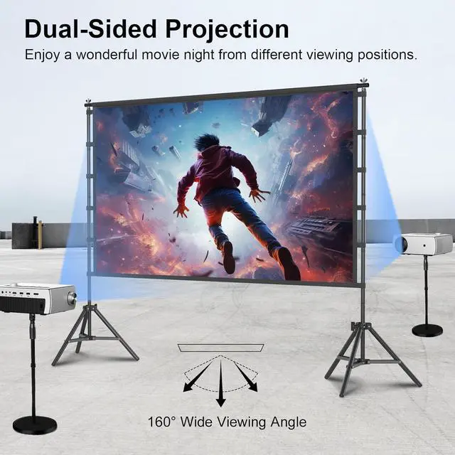 Anti-crease Material Projector Screen: Engineered with thicker fabric than other projection screens, the 120 inch projector screen delivers theater-grade immersion with 16:9 aspect ratio and 160° wide viewing angle. The washable and wrinkle-Free projection screen fabric ensures perfect flatness, while dual-sided projection ensures vivid colors from a variety of viewing positions. Perfect for backyard movie night and home theater.