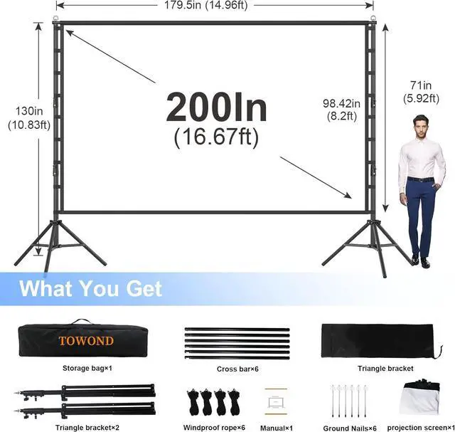 Bigger Screen, Better Experience: Engineered with thicker fabric than other projection screens, this 200 inch projector screen delivers theater-grade immersion with 16:9 aspect ratio, 14.95ft x 10.83ft projection area and 160° viewing angle. The washable, anti-crease fabric ensures perfect flatness, while dual-sided projection ensures vivid colors from any position. Perfect for outdoor movie nights and home theater.