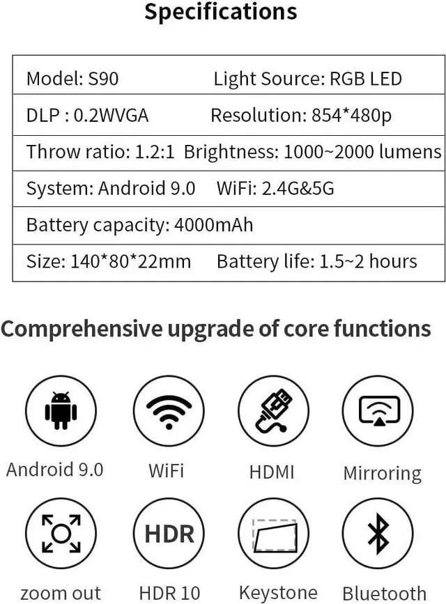 Android 9.0 System----Access all the contents you love. Counting on the Google Play Store(3 million apps), you can download and install apps from the store. Stream content from Netflix, Youtube, and more for enjoying the life. NOTE:Copyrighted content from Hulu, Netflix, and similar services CAN NOT be mirrored or screencast via wireless transmission, but you can download apps from Google play or browse them directly through home theater projector to view copyrighted content from these.