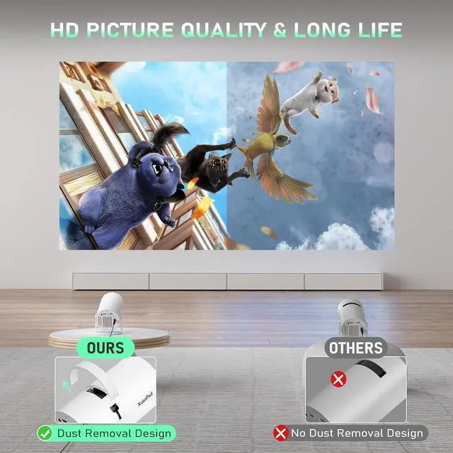 [Dustproof Design] Our mini projector features a multi-layer dustproof mesh and removable side-panel design, effectively blocking debris while making cleaning a breeze. The dual-protection system keeps core components spotless, preventing the annoying black spots that plague other projectors after just 3-6 months of use. Enjoy consistent, high-quality projection every time.