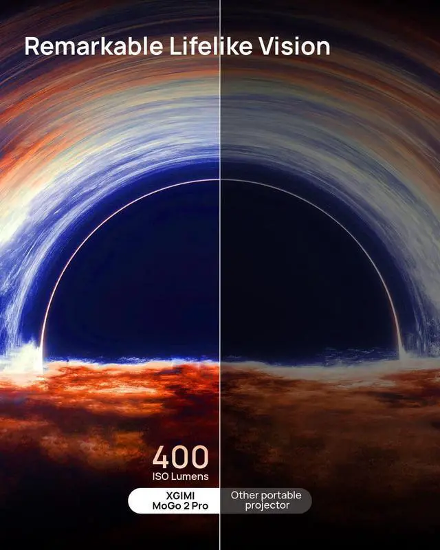 Remarkable Lifelike Vision: 400 ISO lumens movie projector Integrated D65 color temperature standard adopted by Hollywood and a 90% DCI-P3 color gamut, restoring all colors in brilliant, lifelike detail.
