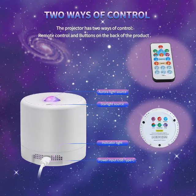 Star Night Light ProjectorProjector has two ways of control: buttons on the back of the product and remote control. When you want to quickly adjust and control the product, the back button turns the power on and off, and adjusts the color of the light, the selection of stars and nebulae, and the sleep mode function on.