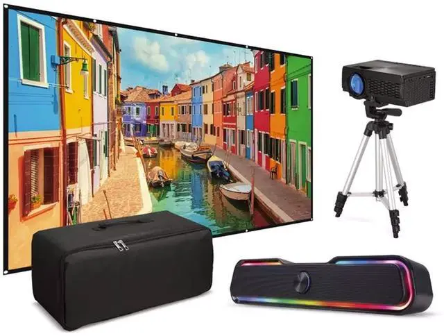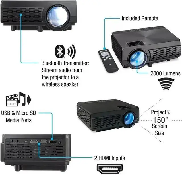 Enjoy cinematic viewing at home with this 150-inch FHD 1080P LED projector built for movies, gaming, and presentations. It delivers sharp 1920 x 1080 resolution, vibrant 2000-lumen brightness, and a 16:9 aspect ratio for an immersive wide-screen experience. Equipped with dual HDMI ports, USB, Micro SD, Mini VGA, composite, and a headphone jack, it supports a wide range of media devices. With dual-channel speakers and multilingual OSD support, its easy to set up and perfect for any entertainment space.
