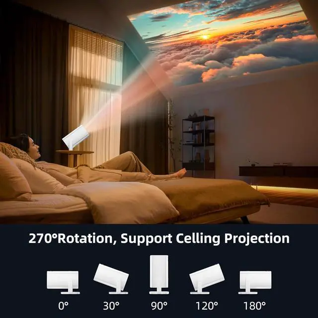 270° Rotatable Stand & Electric Keystone CorrectionThe Q100 mini projector comes with a 270° rotatable stand, allowing you easily project from any angle, even on the ceiling. With electric keystone correction, you can enjoy distortion-free, perfectly aligned images every time, making it the perfect home projector for any setup