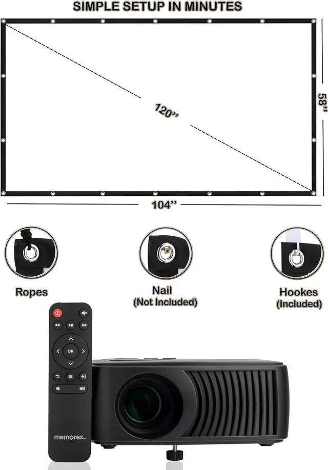 100 PROJECTION SCREEN INCLUDED FOR IMMERSIVE CINEMA EXPERIENCE: The Memorex MX-PJS100 comes with an included 100-inch projection screen, transforming any space into your personal theater. Whether you're watching movies, streaming shows, or playing games, this expansive screen delivers an immersive viewing experience, making it perfect for home entertainment, outdoor movie nights, or family gatherings